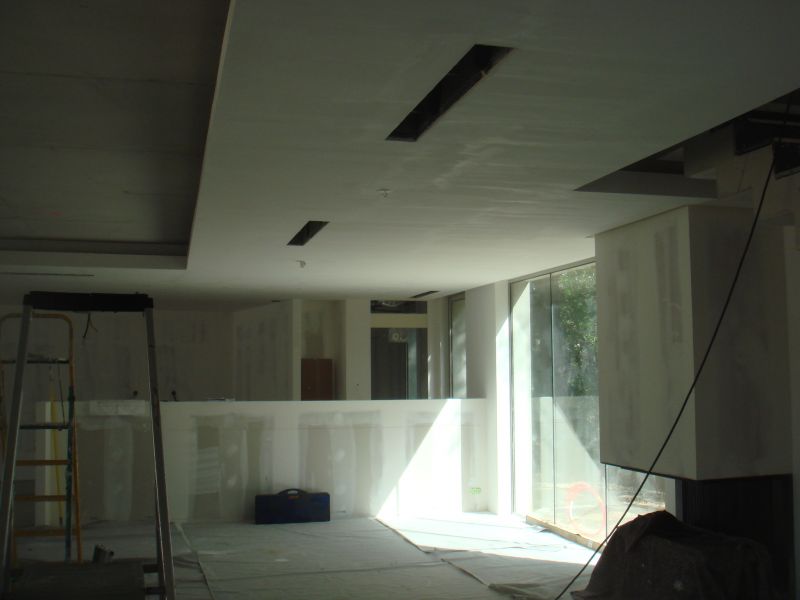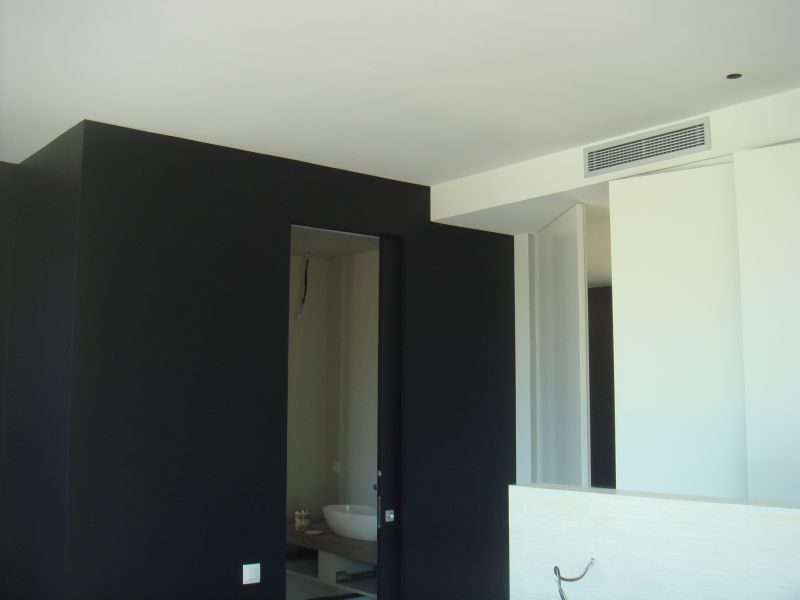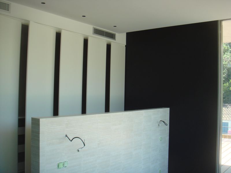 Dans cette villa de style comtemporain située sur Marseille, le client souhaitait une peinture mat aspect tendue, la Sté Valdès a donc proposé une peinture laque acrylique lessivable de La Seigneurie.L'application d'une laque nécessite toujours un enduit général des supports, un ponçage fin soigné et trois couches de peinture.